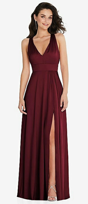 Shirred Shoulder Criss Cross Back Maxi Dress with Front Slit in cabernet