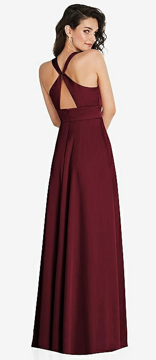 Tie Halter Open Back Trumpet Gown in cabernet