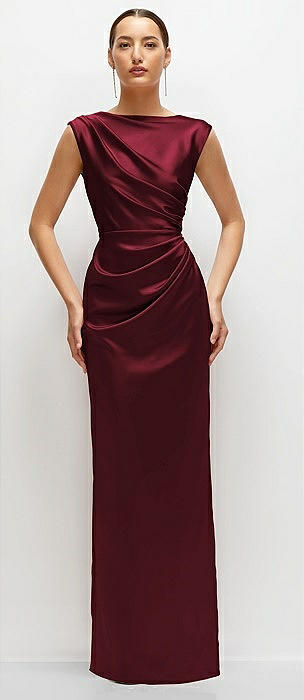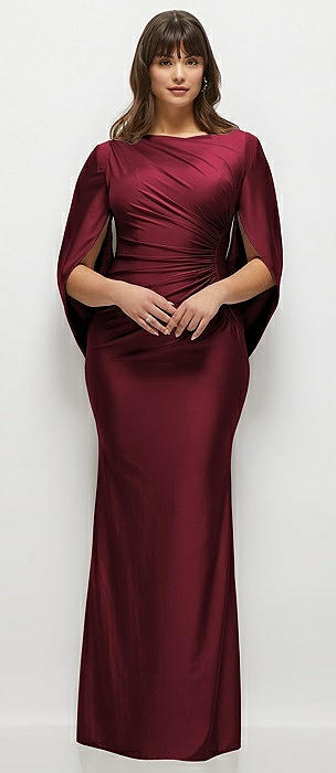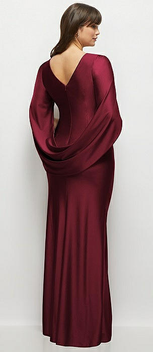 Draped Stretch Satin Maxi Dress with Built-in Capelet in cabernet