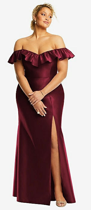 Off-the-Shoulder Ruffle Neck Satin Trumpet Gown in cabernet