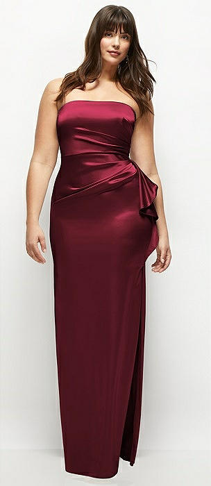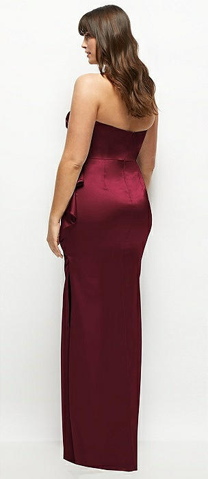 Strapless Draped Skirt Satin Maxi Dress with Cascade Ruffle in cabernet