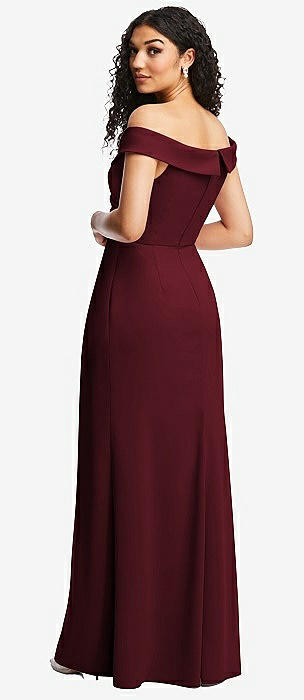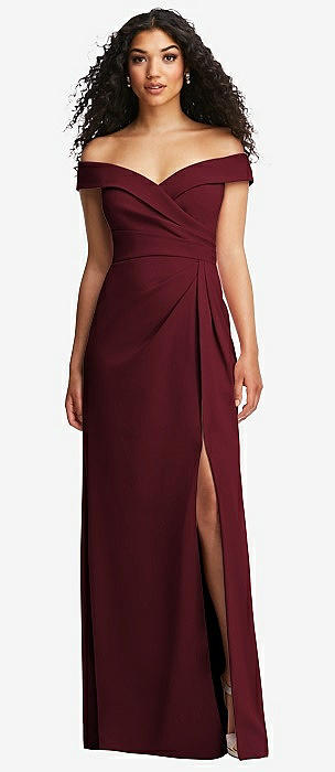 Cuffed Off-the-Shoulder Pleated Faux Wrap Maxi Dress in cabernet