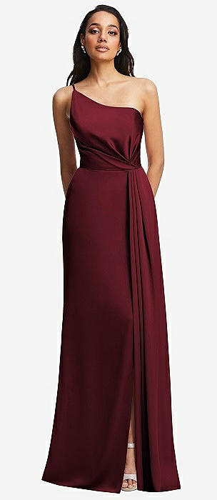 One-Shoulder Draped Skirt Satin Trumpet Gown in cabernet