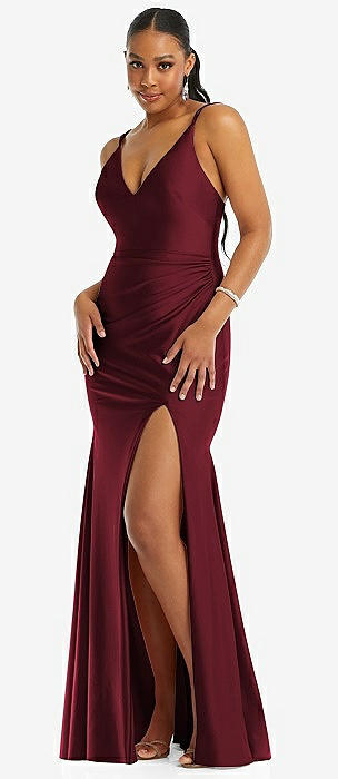 Deep V-Neck Stretch Satin Mermaid Dress with Slight Train in cabernet