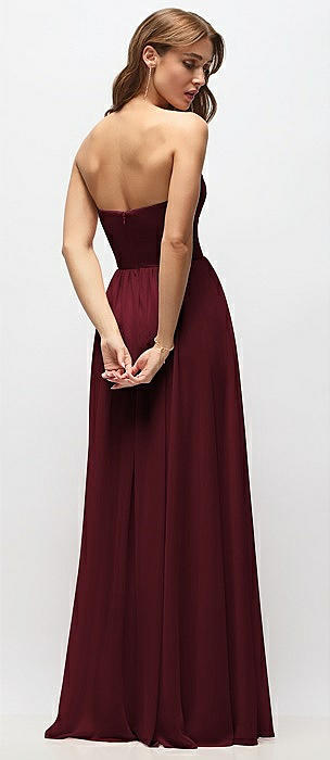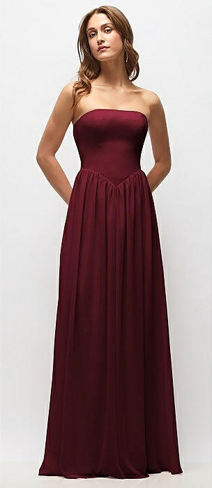 Strapless Basque Drop Waist Chiffon Maxi Dress with Shirred Skirt in cabernet