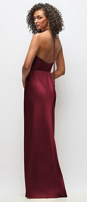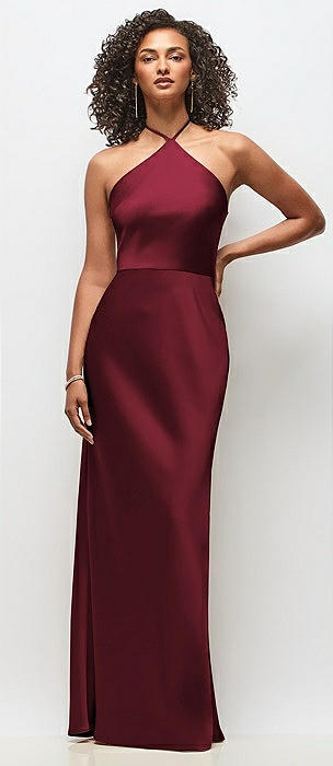 High-Neck Halter Stretch Satin Maxi Dress with Bias A-line Skirt in cabernet