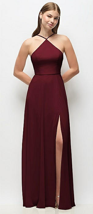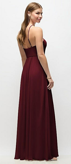 High-Neck Halter Chiffon Maxi Dress with Adjustable Spaghetti Straps in cabernet