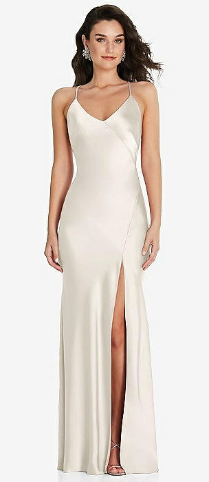V-Neck Convertible Strap Bias Slip Dress with Front Slit in ivory