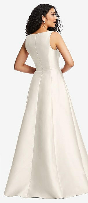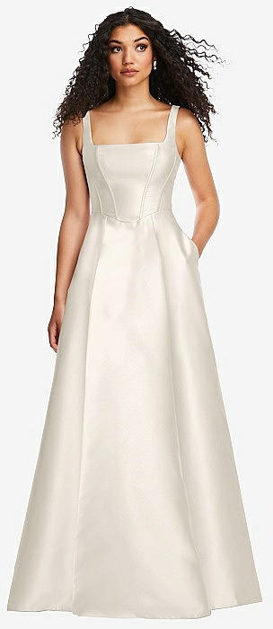 Boned Corset Closed-Back Satin Gown with Full Skirt and Pockets in ivory