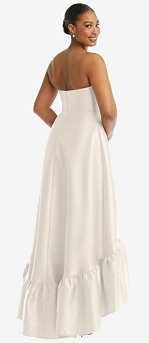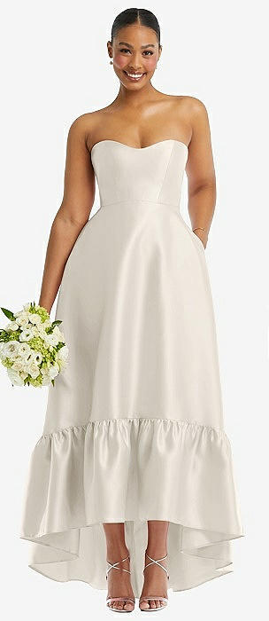 Strapless Deep Ruffle Hem Satin High Low Dress with Pockets in ivory
