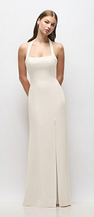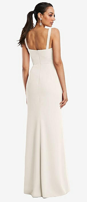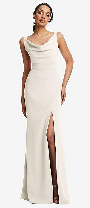 Cowl-Neck Wide Strap Crepe Trumpet Gown with Front Slit in ivory