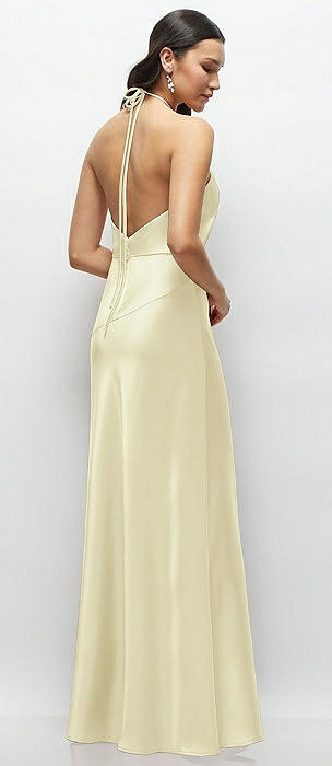 Plunge Halter Open-Back Maxi Bias Dress with Low Tie Back in butter yellow