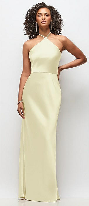 High-Neck Halter Stretch Satin Maxi Dress with Bias A-line Skirt in butter yellow