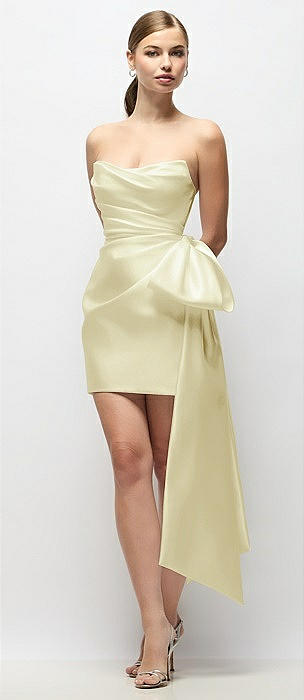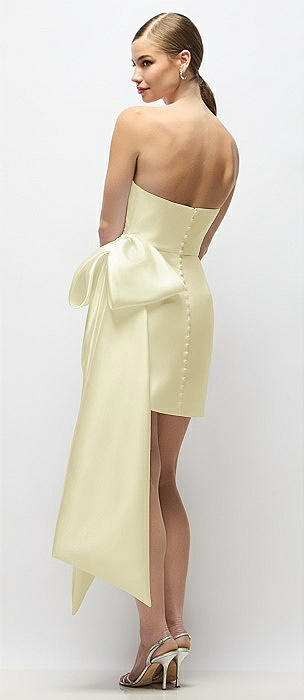 Strapless Pleated Draped Satin Mini Dress with Dramatic Long Tail Bow & Covered Buttons in butter yellow