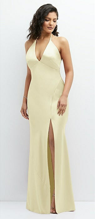 V-Neck Halter Satin Trumpet Gown in butter yellow