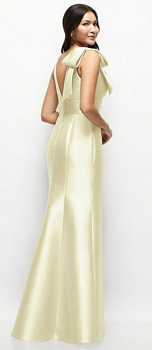 Deep V-back Satin Trumpet Dress with Cascading Bow at One Shoulder in butter yellow