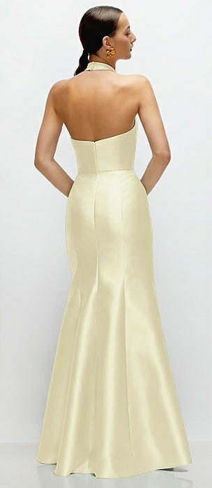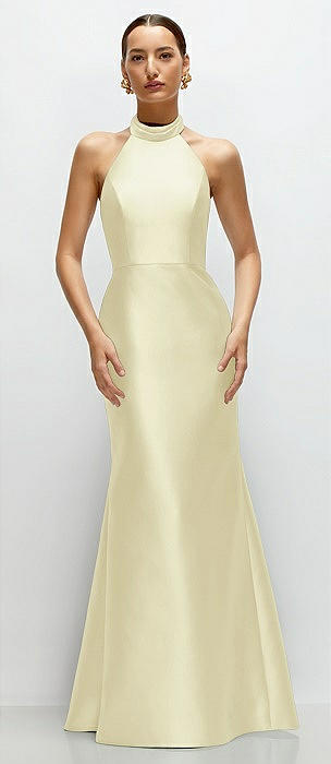 High-Neck Halter Open-Back Satin Trumpet Dress in butter yellow