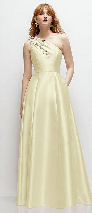 One-Shoulder Full A-Line Satin Gown with Handworked Floral Appliqué in butter yellow