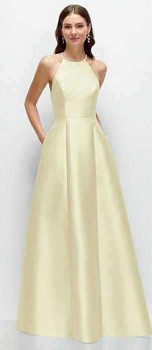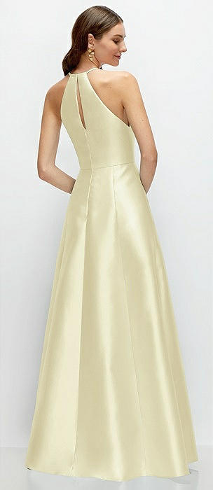 Jewel Neck Halter Full A-Line Satin Maxi Dress in butter yellow