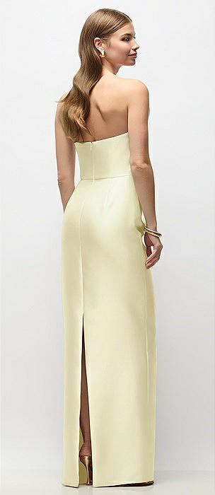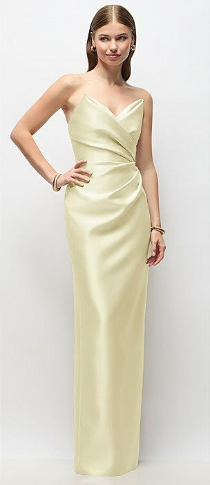 Strapless Asymmetrical Draped Satin Column Maxi Dress in butter yellow