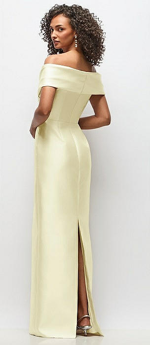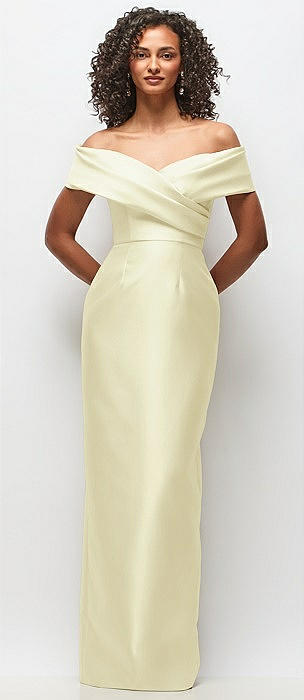 Draped Wrap Off-the-Shoulder Satin Column Floral Maxi Dress in butter yellow