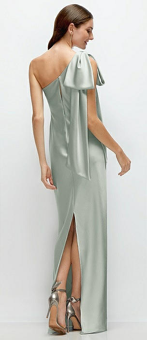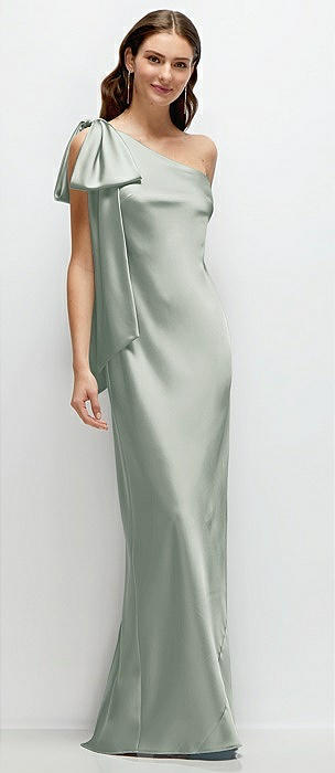 One-Shoulder Bias-Cut Satin Maxi Dress with Cascading Shoulder Bow in willow green