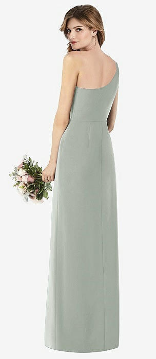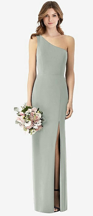 One-Shoulder Crepe Trumpet Gown with Front Slit in willow green