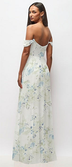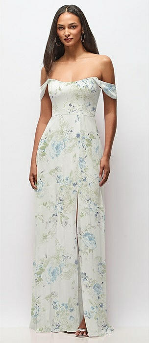 Off-the-Shoulder Basque Neck Maxi Dress with Flounce Sleeves in bleu garden