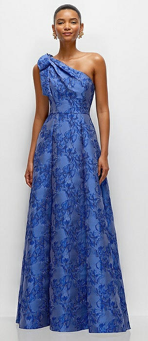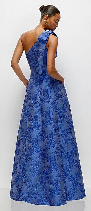 Cobalt Blue Bow One-Shoulder Full A-Line Floral Metallic Jacquard Maxi Dress in cobalt jacquard