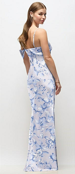 Bow One-Shoulder Satin Floral Maxi Dress with Trumpet Skirt in porcelain blue seraphina floral