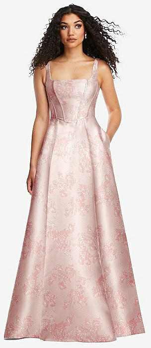 Boned Corset Closed-Back Floral Satin Gown with Full Skirt in bow and blossom print
