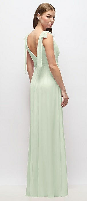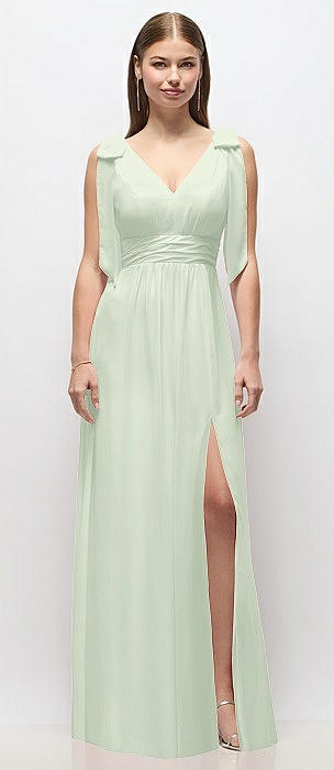 Plunge Neckline Bow Shoulder Empire Waist Chiffon Maxi Dress in mint green