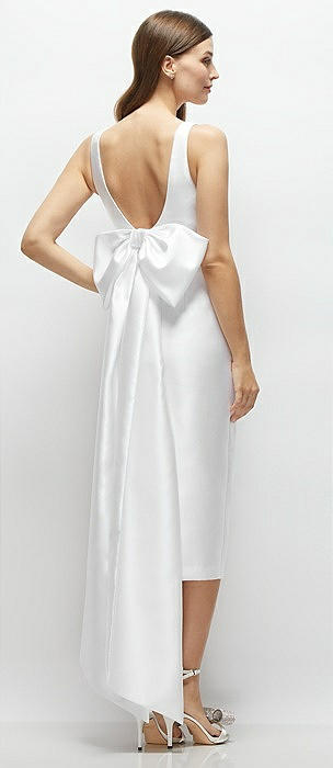 Scoop Neck Corset Satin Midi Dress with Floor-Length Bow Tails in white