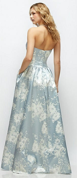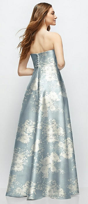 Strapless Floral Satin Gown with Full Skirt and Covered Buttons at Back in porcelain blue seraphina floral