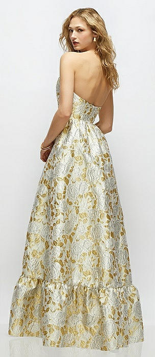 Strapless Cat-Eye Boned Bodice Gold Leaf Brocade Maxi Dress with Ruffle Hem in winter rose