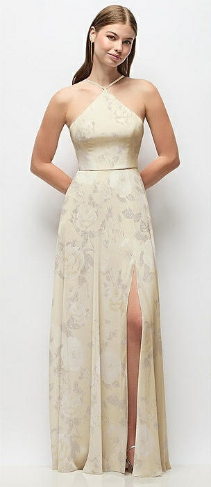 High-Neck Halter Floral Chiffon Maxi Dress with Adjustable Spaghetti Straps in butter yellow floral