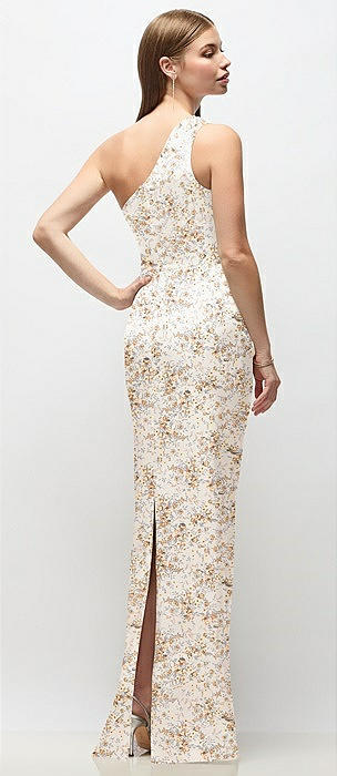 One-Shoulder Draped Bodice Floral Stretch Satin Column Maxi Dress in golden hour