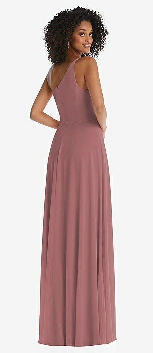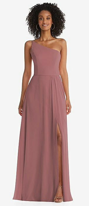 One-Shoulder Chiffon Maxi Dress with Shirred Front Slit in rosewood