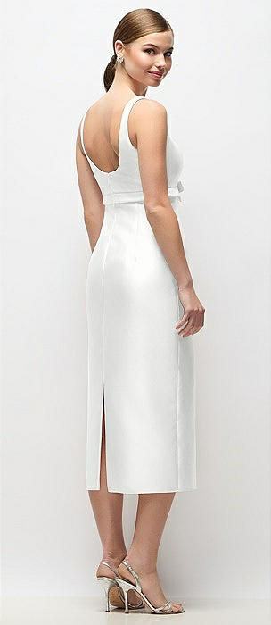 Scoop Neck Satin Column Midi Dress with Bow at Empire Waist in white
