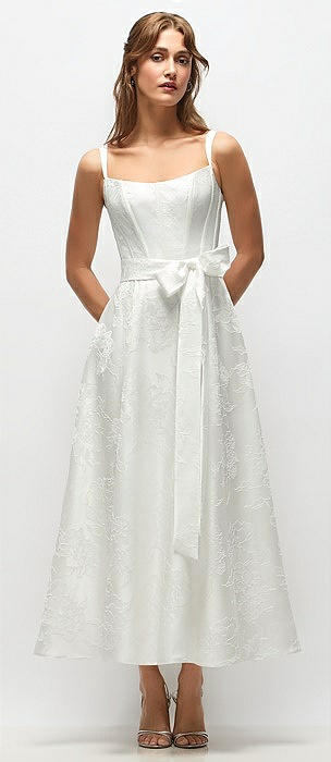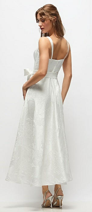 Shaped Strap Boned Corset Embossed Floral Jacquard Bride Dress with Full Midi Skirt & Sash in off white
