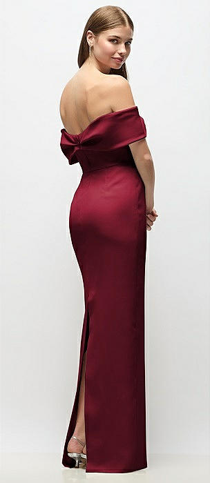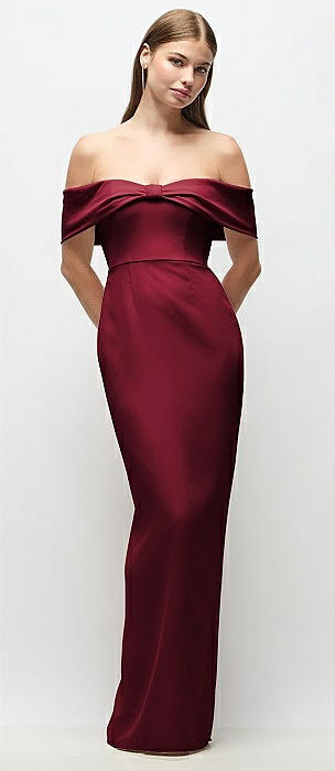 Off-the-Shoulder Crepe Column Maxi Dress with Bow-Pinch Detail in burgundy
