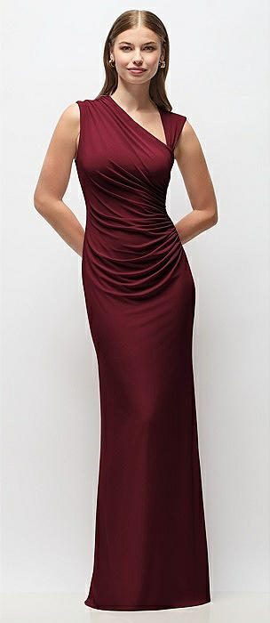 Asymmetrical Cap Sleeve Matte Jersey Column Maxi Dress with Fanned Ruching in cabernet