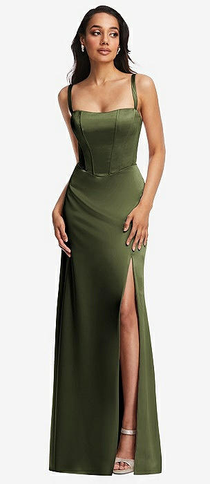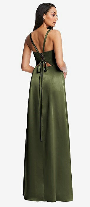 Lace Up Tie-Back Corset Maxi Dress with Front Slit in olive green