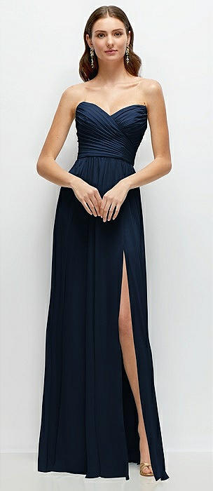Strapless Pleated Surplice Chiffon Maxi Dress with A-Line Skirt in midnight navy