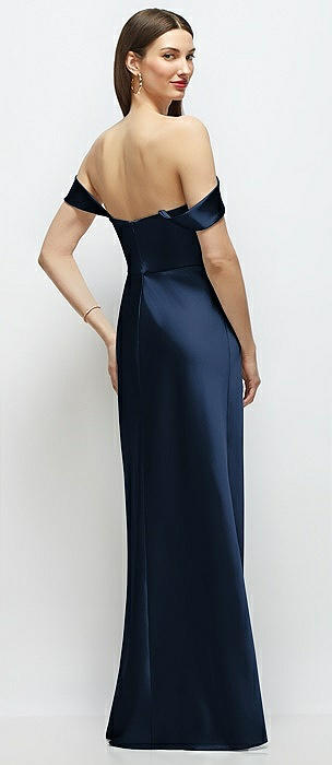 Basque-Neck A-Line Stretch Satin Maxi Dress with Off-the-Shoulder Drape in midnight navy