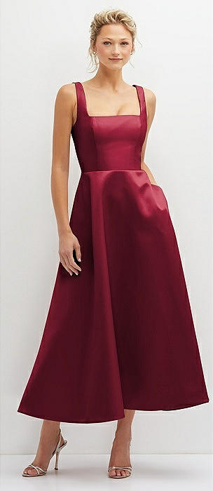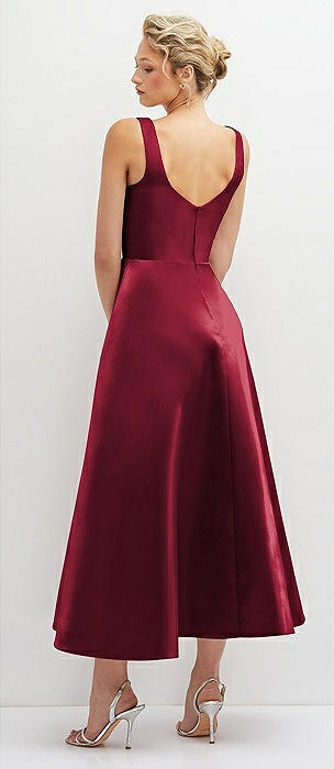 Square Neck Satin Midi Dress with Full Skirt & Pockets