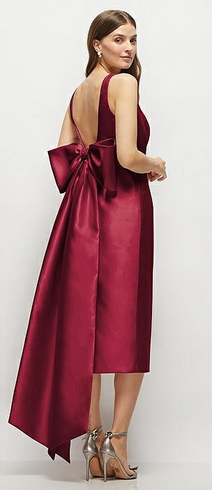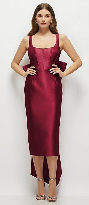 Scoop Neck Corset Satin Midi Dress with Floor-Length Bow Tails