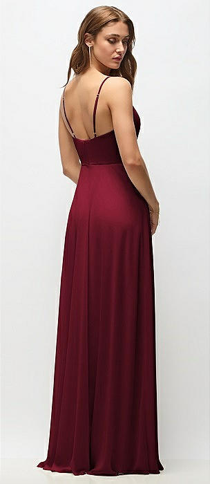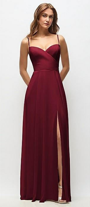 Wrap Bodice Chiffon Maxi Dress with Adjustable Spaghetti Straps in burgundy