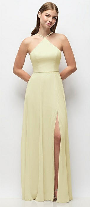 High-Neck Halter Chiffon Maxi Dress with Adjustable Spaghetti Straps in butter yellow