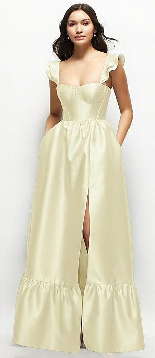 Boned Corset Closed-Back Satin Gown with Full Skirt and Pockets in butter yellow